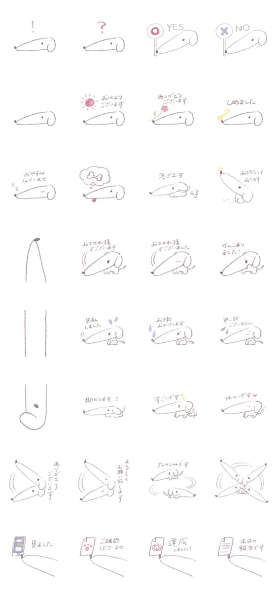 | スタンプ説明 | 顔がながい犬のスタンプです。からだはちいちゃめ。敬語が使えます。 |