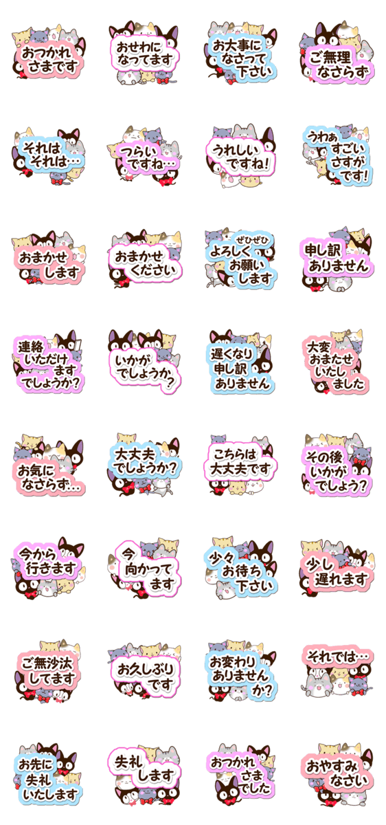 『ネコいっぱい!』の猫スタンプから、敬語で丁寧な言葉を集めた【大人な返信編】になります。基本的な言葉を集めているので、どなたにでも使えるスタンプです。【かたこ】