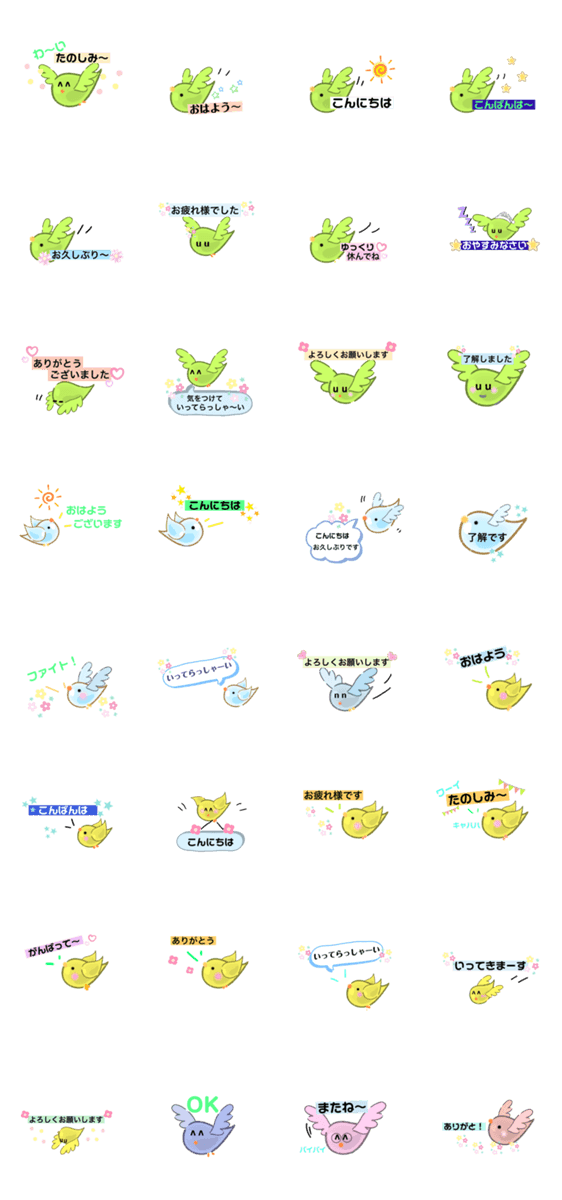LINE Creators Studioでつくったスタンプです。いろんな小鳥の表情や声かけで、ホッと笑みのこぼれるものを目指して作ってみました。