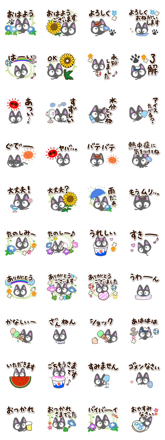 『ちびクロ』スタンプの【夏】版です。基本的な言葉を集めて、夏バージョンにしました。暑い時期にピッタリです。黒猫好きな方にぜひ。【かたこ】