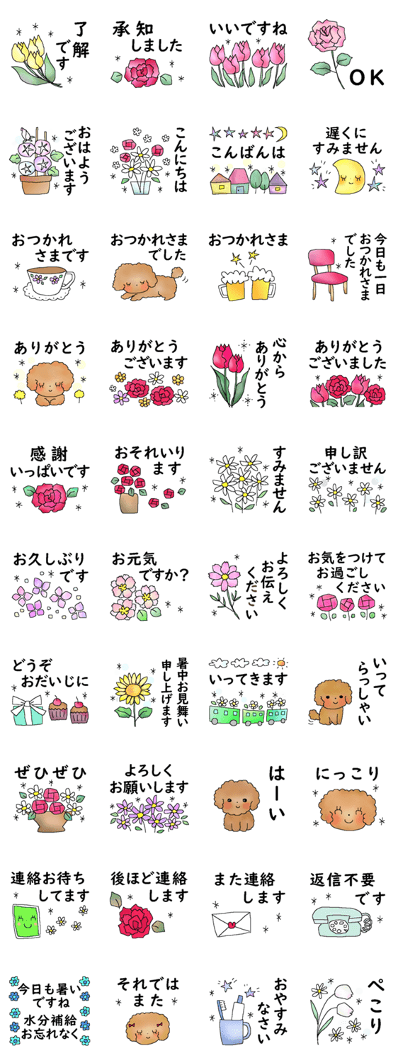 文字が大きくて見やすい、シンプルな大人の敬語スタンプ。夏に便利な暑中見舞いや感謝の言葉、日常の挨拶など、気持ち伝わる花いっぱいの40個です。