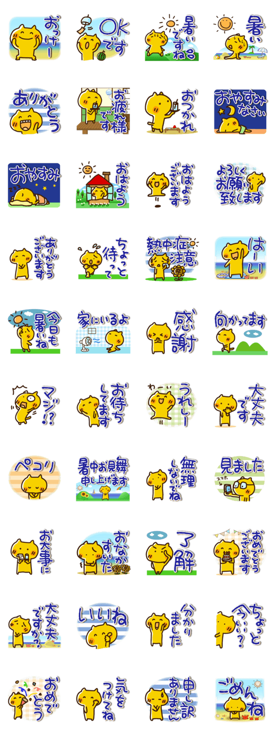 いろんな可愛いポーズの黄色いネコに癒されます。気遣いや日常会話、敬語もあるので毎日使えて便利です。夏にピッタリの青色デカ文字や夏のアイテムも入ってます。