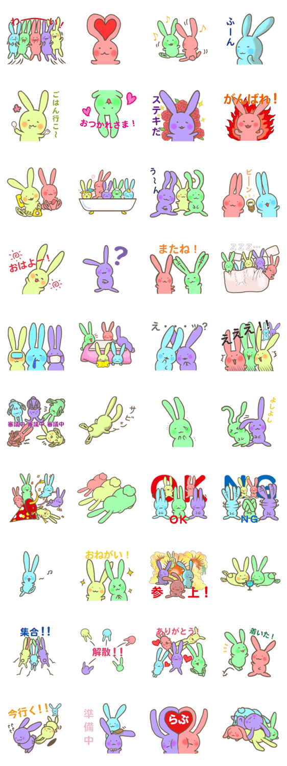 | スタンプ説明 | カラフルな5色のうさぎたちが、あなたのLINEをパッと彩ります! |