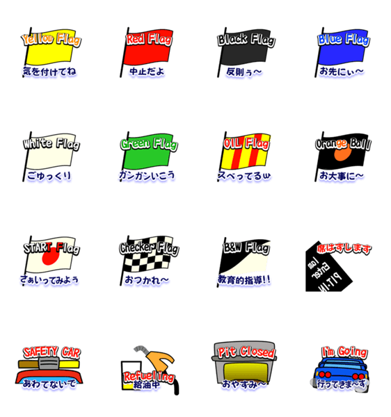 | スタンプ説明 | モータースポーツの旗を日常に使えるように意訳してみました。 |