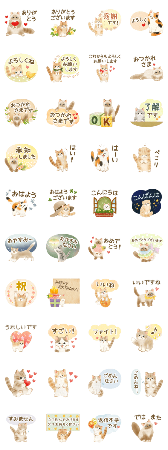 手書きのねこのイラストに、よく使う基本のメッセージを添えました。友だち同士で使えるものから敬語まで。色々なシーンで使いやすいセットです。