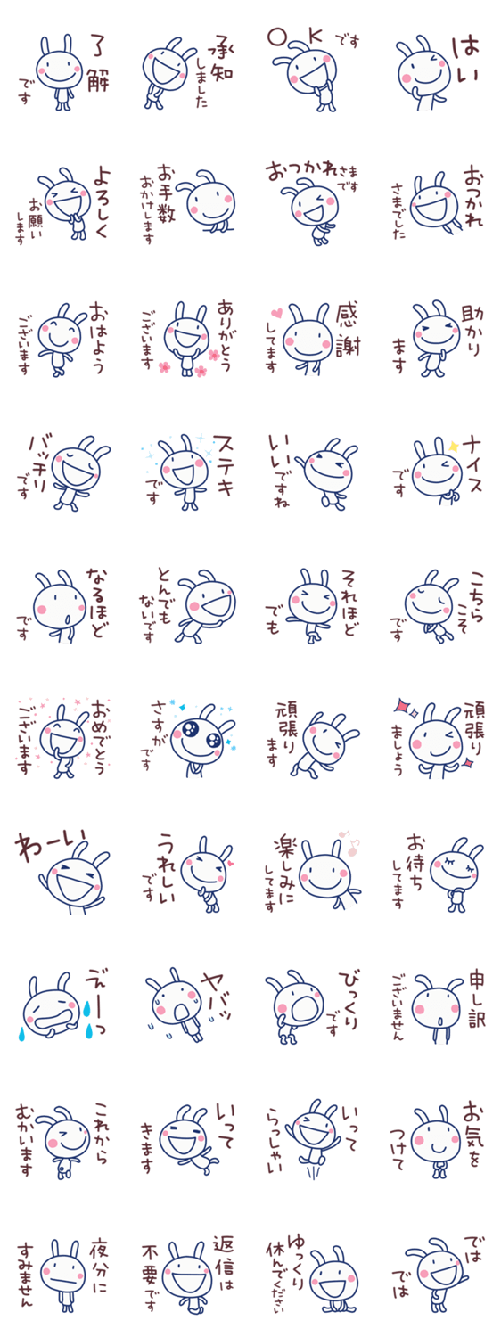 | スタンプ説明 | ほぼ白うさぎ。敬語編。「承知しました」「お手数おかけします」から「返信は不要です」まで。あなたの気持ちを、丁寧な言葉にのせて届けよう。 |