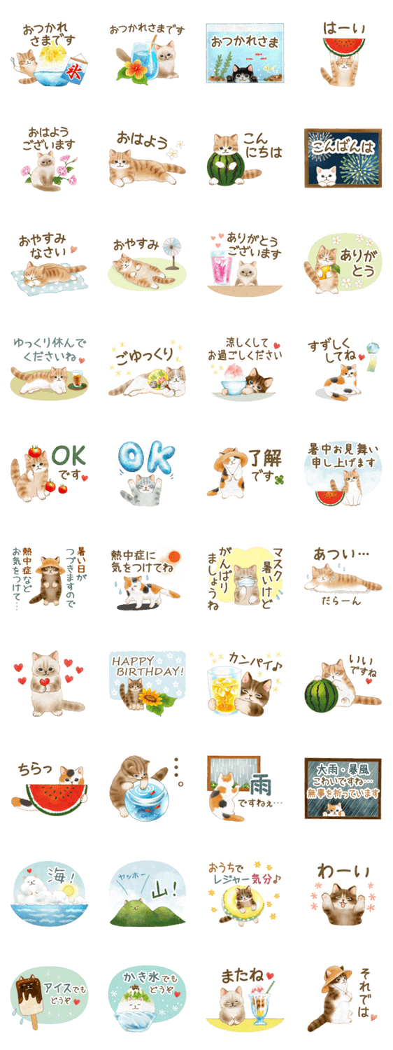 ねこたちの、夏をイメージしたイラストのスタンプです。 友だち同士で使えるものから敬語まで。色々なシーンで使いやすいセットです。