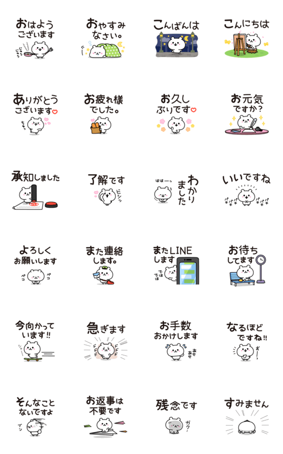 毎日使える基本の敬語と小さくてかわいいシロクマのデカ文字アニメーションスタンプ♪大きな文字とよく使う言葉でとっても便利!