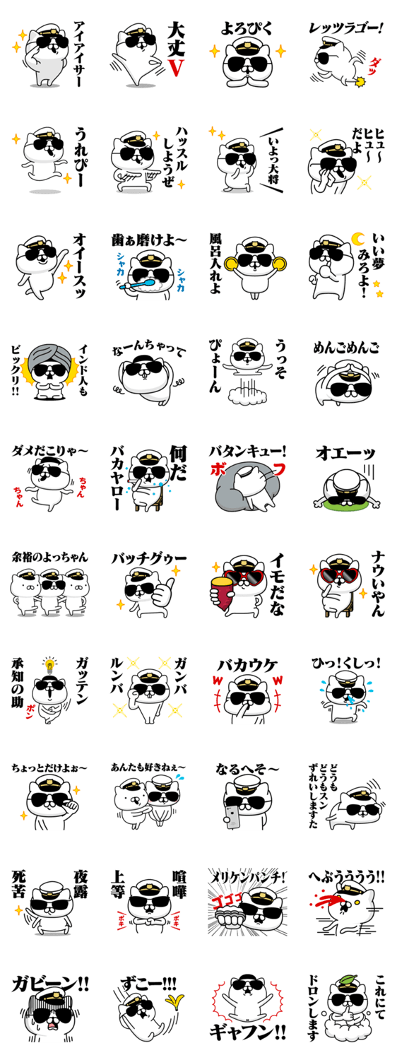 | スタンプ説明 | 第二弾/昭和/死語/平成/ダジャレ/オヤジギャク/軍隊/自衛隊/陸軍/海軍/空軍/サバゲー/エージェント/ミリタリー/兵隊/毎日使える/日常会話/挨拶/家族/ネイビー/マリーン |
