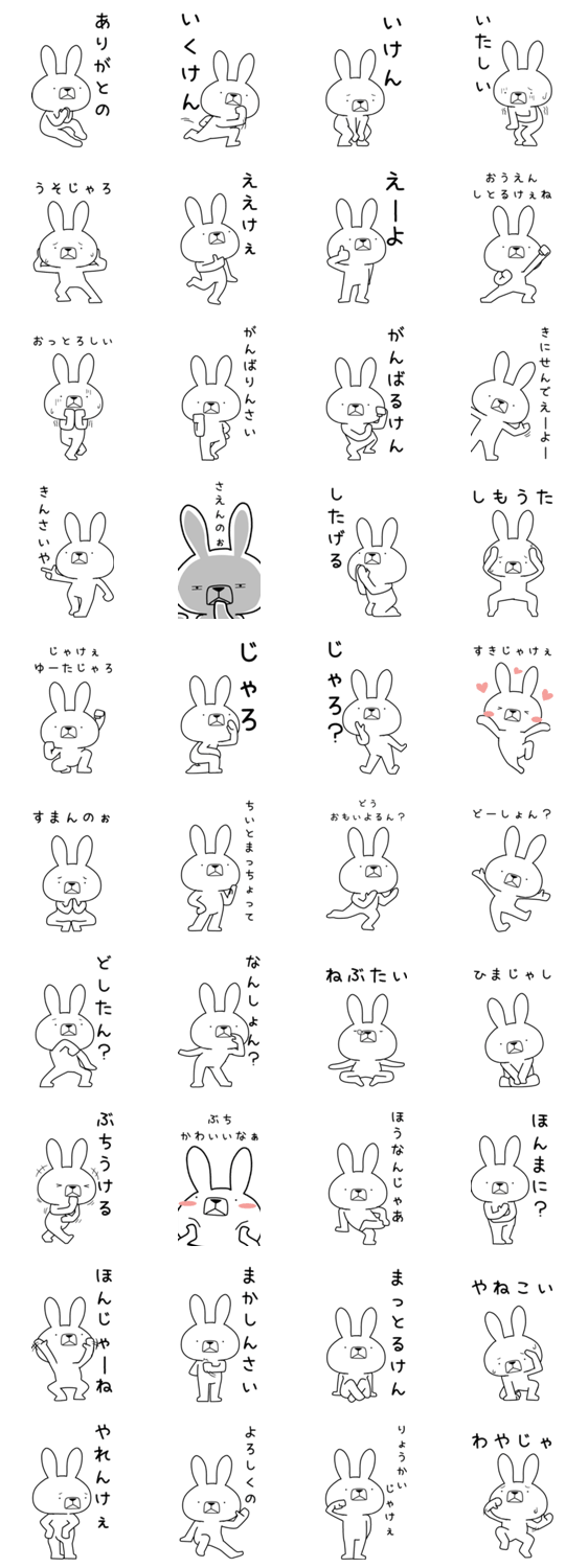 いろんな方言をつかううさぎのスタンプBIG広島弁編(中国地方、そうでない方も使えるかも。また違う県verに似た方言が見つかるかも) ※このスタンプはトークルームで大きく表示されるBIGスタンプです。