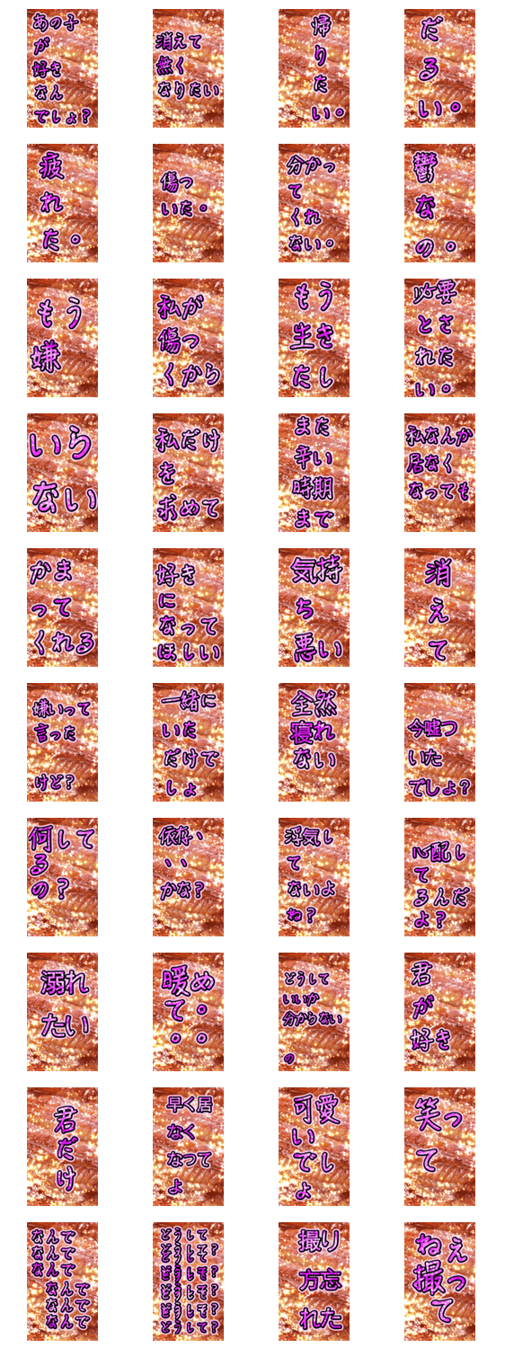 「チュキ?」、「あの子が好なんでしょ?」、「消えてなくなりたい」 メンヘラボイス!多数満載! ※このスタンプはトークルームで大きく表示されるBIGスタンプです。