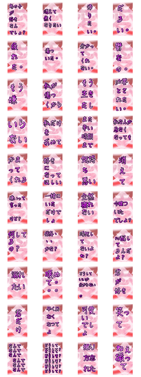 「チュキ?」、「あの子が好なんでしょ?」、「消えてなくなりたい」 メンヘラボイス!多数満載! ※このスタンプはトークルームで大きく表示されるBIGスタンプです。