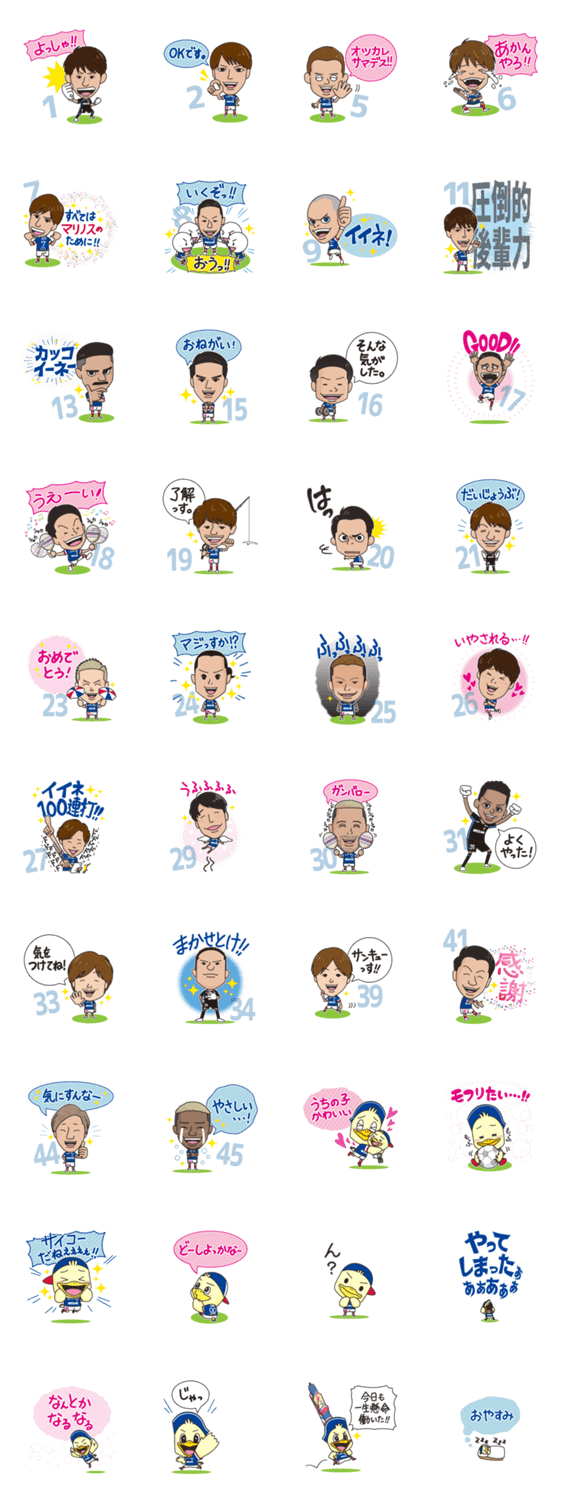 | スタンプ説明 | 今年も横浜F・マリノスの選手たちがスタンプになりました。全選手が登場! 試合の日はもちろん、試合日以外もたくさん使ってね~♪ |