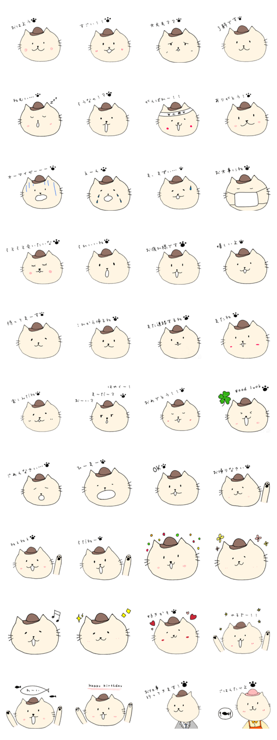 帽子をかぶったねこのゆるいスタンプです。