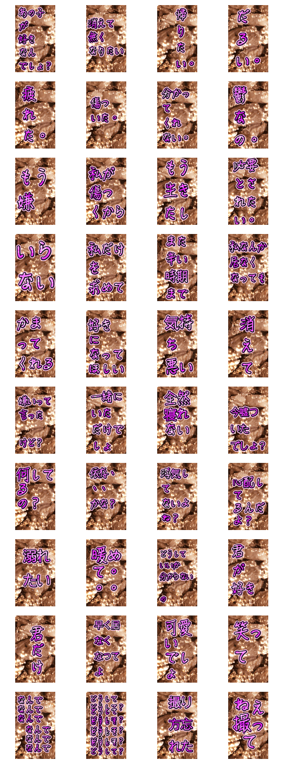 「チュキ?」、「あの子が好なんでしょ?」、「消えてなくなりたい」 メンヘラボイス!多数満載! ※このスタンプはトークルームで大きく表示されるBIGスタンプです。