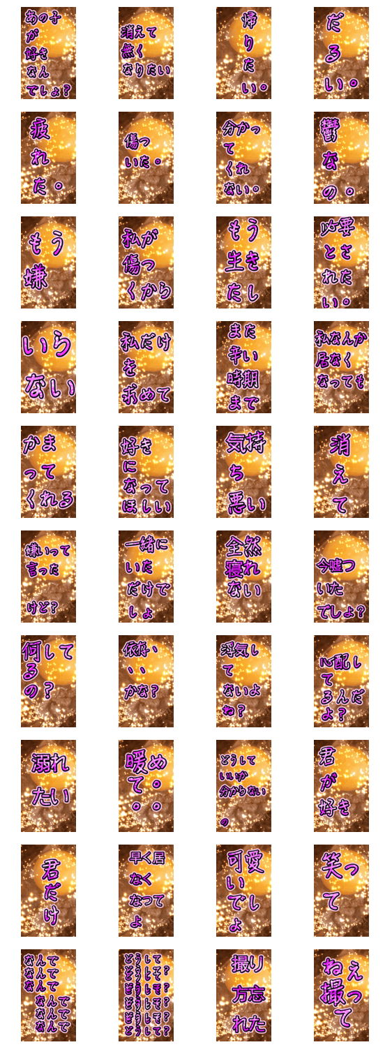 「チュキ?」、「あの子が好なんでしょ?」、「消えてなくなりたい」 メンヘラボイス!多数満載! ※このスタンプはトークルームで大きく表示されるBIGスタンプです。