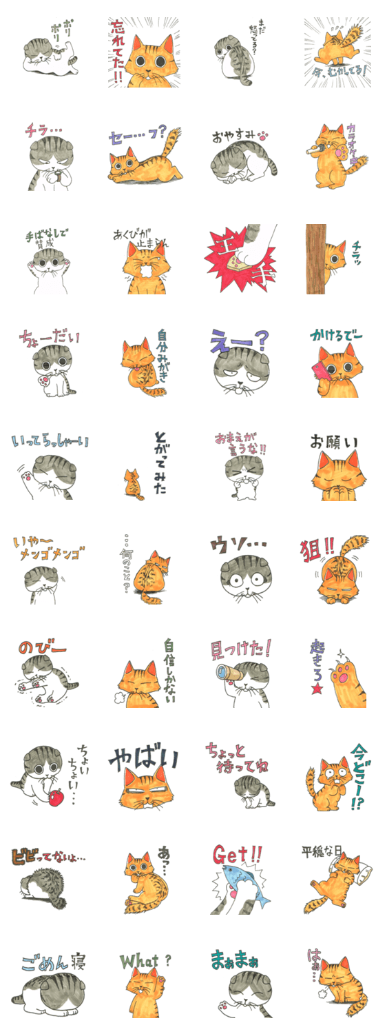 うちのキャツらの別バージョンです。手塗りです。友達同士のやり取りに使いやすいスタンプにしました。