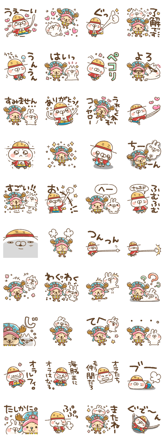 | スタンプ説明 | ねことうさぎの名前スタンプシリーズのねことうさぎ。ワンピース(ONE PIECE)とのコラボスタンプです♪チョッパーとルフィ?がいるよ。長く使える無難な内容。山田まぽん作 |