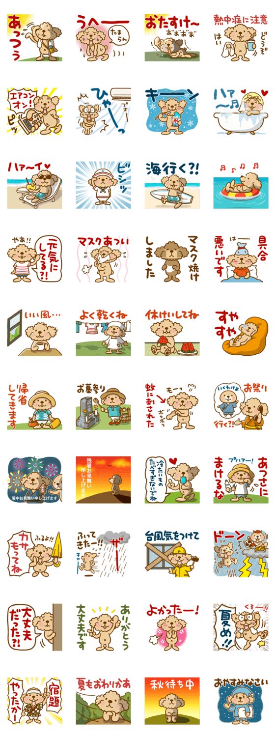 トイプードルのぷう太郎の、暑い日、夏の食べ物、台風、大雨、帰省にお墓参り、暑中見舞い、残暑見舞いまで、使いやすい夏スタンプです。