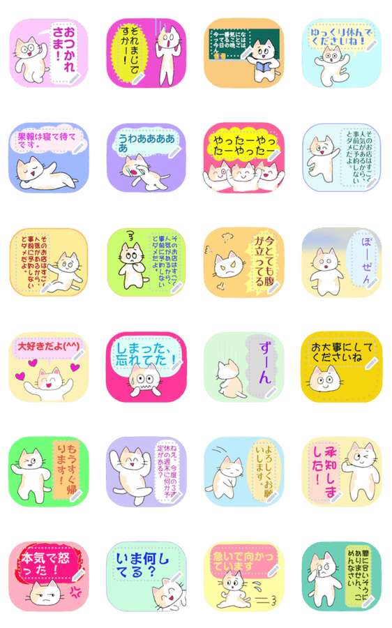 ラフなのんきネコの毎日使えるメッセージスタンプです。背景付きなので見やすく使いやすい日常の感情を表現したポーズをとってます。 現在この商品は一部のスマートフォン版LINE 10.3.0以上のトークルームでのみ使用できます。動作環境の最新情報はヘルプをご確認ください。
