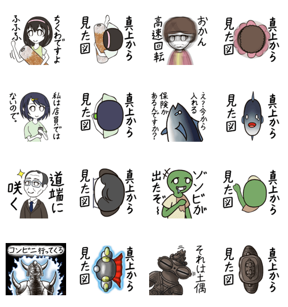 なんとすべてのイラストに「真上から見た図」が付いてくる大変お得なスタンプです。(マグロもあるよ!)