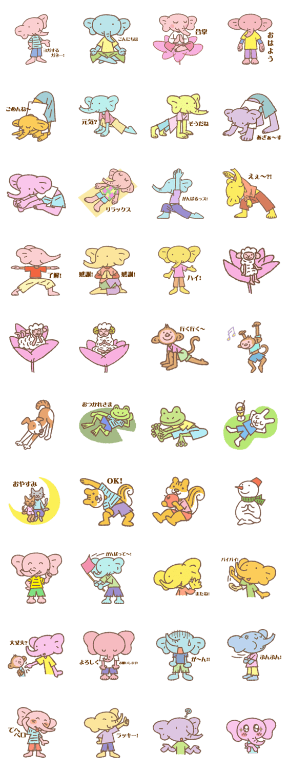 ガネーちゃんの祖先は、インドの象神様。お得意のヨガで仲間たちと愉快にレッスン! ヨガする人も、そうでない人も、いろんなポーズで癒し癒され楽しくトークしてね。