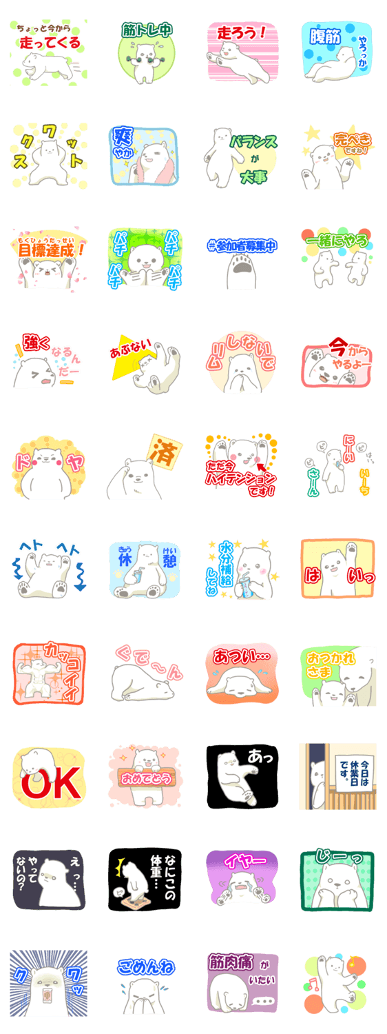 筋トレをするしろくまのスタンプ。 宅トレ中にもつかえるスタンプや日常で使えるスタンプなどがあります。