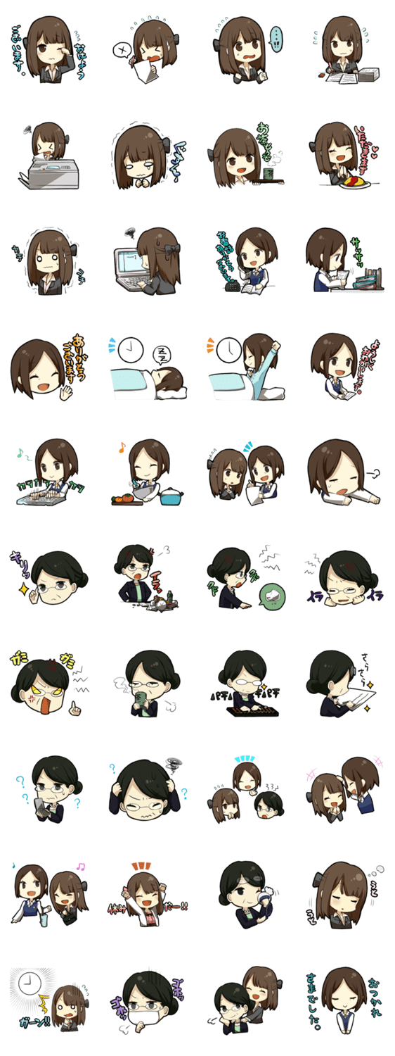 ビジネスでも使える!?かわいいOLさん達のスタンプ!一生懸命な新人さん、バリバリ働くベテラン、こわ~いお局様の3人セットで、幅広いシチュエーションに対応致します!