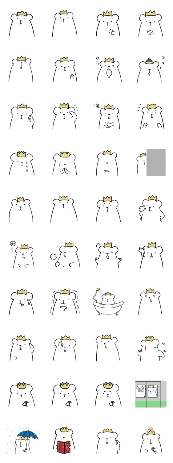 しろくまの王さまのスタンプです。のんびり屋で、すこしおっちょこちょいな王さまが、表情豊かに気持ちを伝えます。