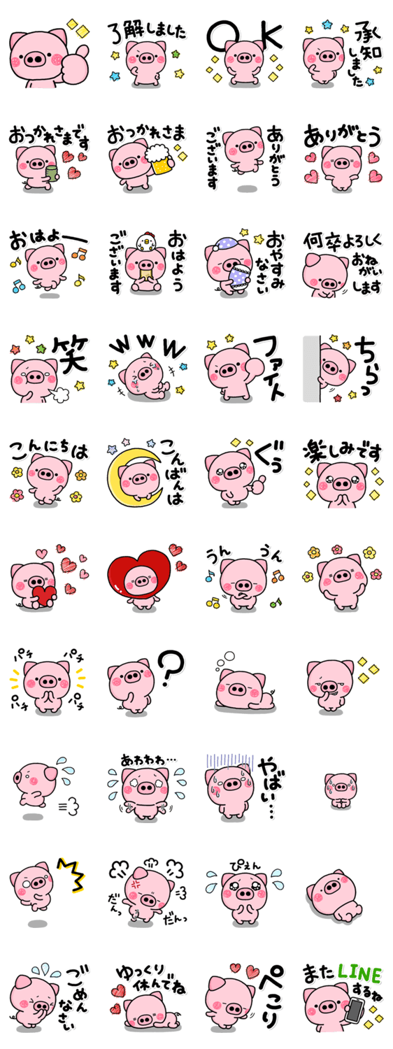 大人の方におススメ!大きな文字で見やすく、スタンプを使うときも大きな文字なので選びやすい♡ぶたさんのゆるゆるスタンプです。【作:いしいともこ】