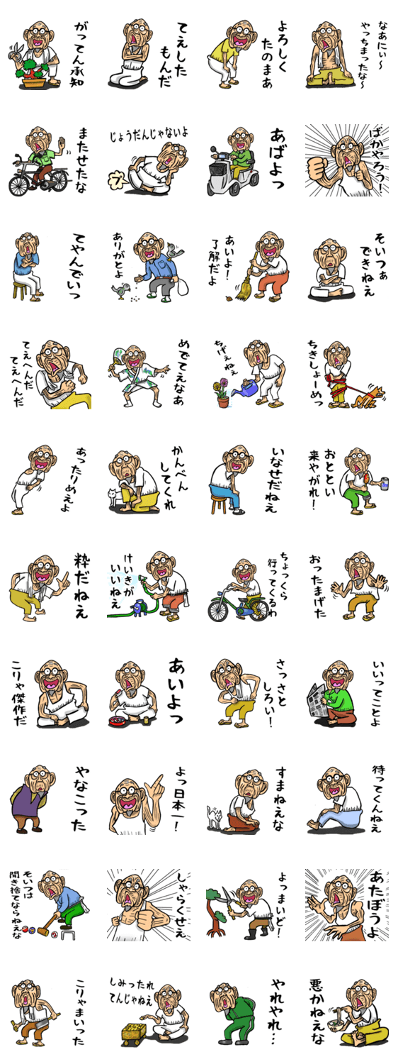 | スタンプ説明 | 東京都の下町に住んでいる元気で粋なおじいさんが、東京下町の言葉、江戸っ子の言葉、江戸言葉を喋ります。 |