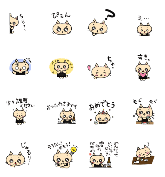 スタンプ説明 酒が目にあるネコ。日本酒大好き!飲みすぎには注意