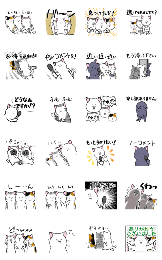 まるでマスコミのインタビュアーのように相手に迫るねこのスタンプです。グイグイ質問したいときや、返事の催促に。