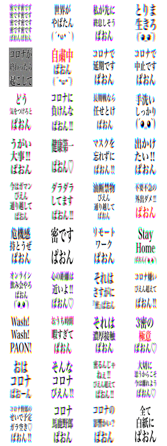 コロナぱおん!初めて聞いた時ゾウの鳴き真似し始めたかと思ったwまじぱおん!これから使っていこう。 カラフル、映える、コロナウイルス収束、祈願、ぴえん、 ※このスタンプはトークルームで大きく表示されるBIGスタンプです。