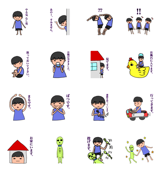 やる気なし男くんのスタンプです‼︎愛想がない男の子で、表現するのが苦手ですが、よろしくお願いします(。-∀-)お友達の宇宙人人形くんも一緒だよ‼︎