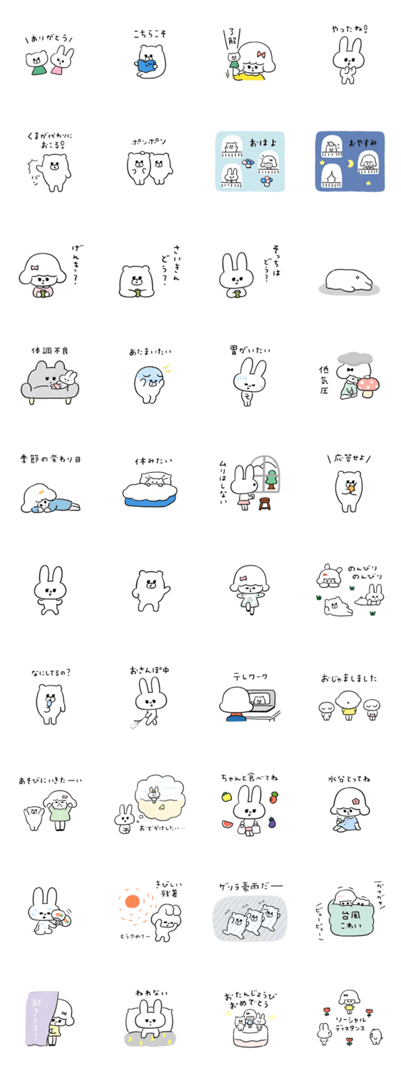 るーしーとくま、むくみちゃんのコラボ?スタンプです。 元気ない時や体調不良のスタンプ多めです。夏に関係したスタンプも少し。