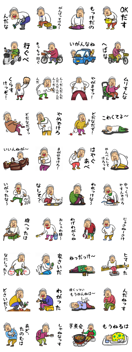| スタンプ説明 | 山形県のおばあさんスタンプ第二弾です。山形県に住んでいる元気で優しいおばあさんが、山形県の方言、山形弁を喋ります。 |
