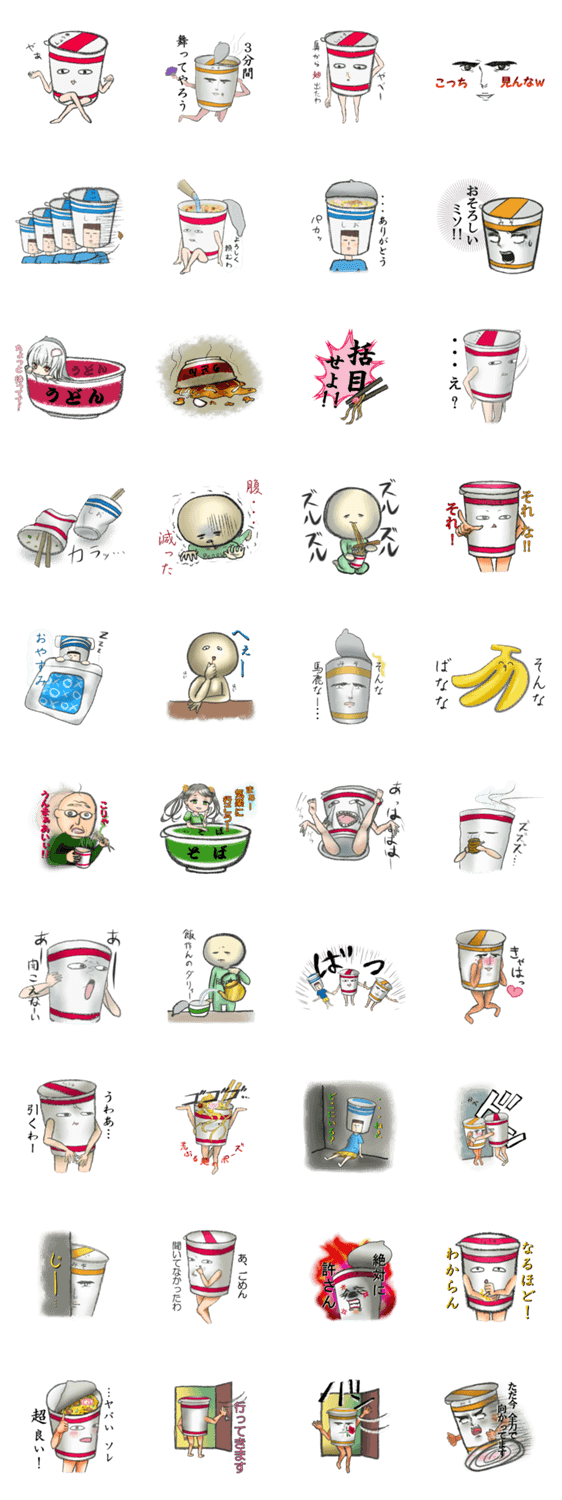 新属性「カップ麺系男子」が繰り広げる激しい感情表現スタンプ。しょうゆ味、塩味、みそ味…。うどんとそばもいるよ☆
