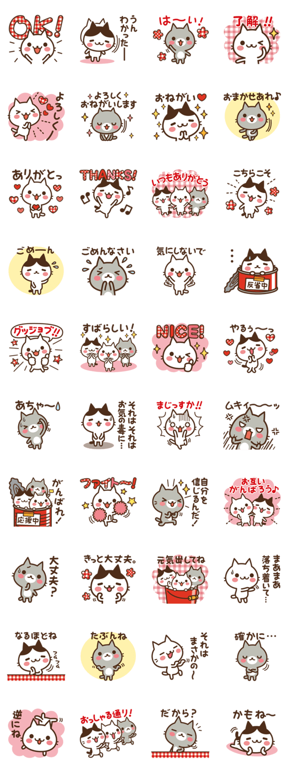 かわいいにゃんこと、よく使う言葉、使いたい言葉がギュッと缶に詰められたみたいなスタンプです。