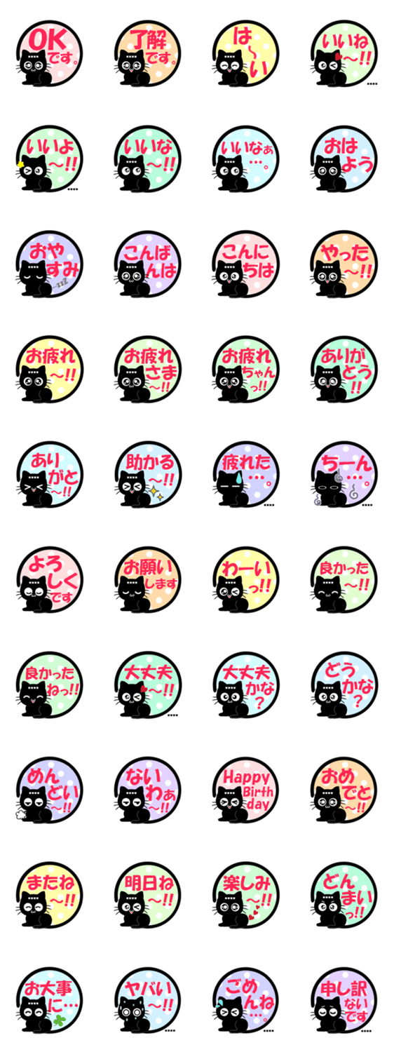 可愛い黒猫を添えた日常のよく使う挨拶や言葉を揃えました。黒猫のおでこに4文字まで名前をいれられます。