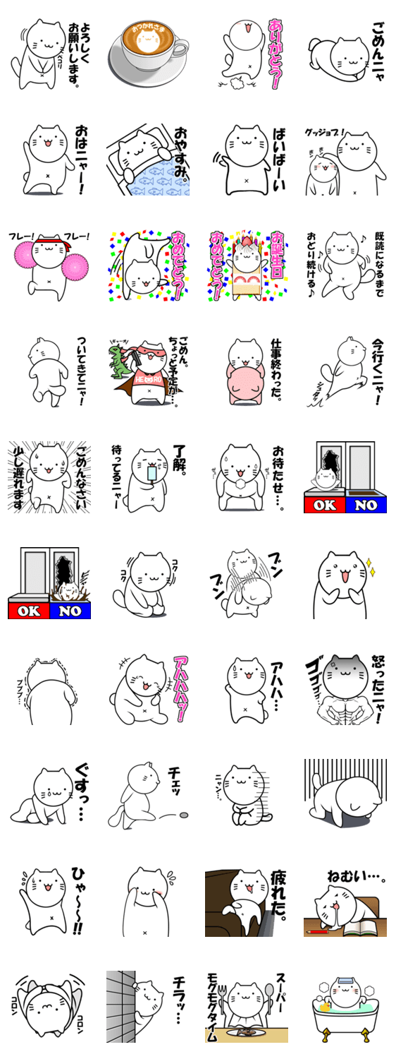 | スタンプ説明 | ふぁんしーあいらんど管理人が公開しているフラッシュアニメ「ねこショー」に登場する、シュールでどこか哀愁ただよう猫のスタンプ。 |
