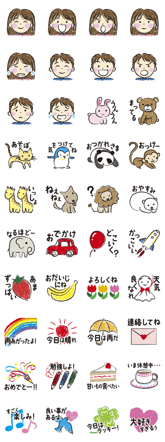かわいい、やさしいクレヨン画で、ほのぼのして欲しいなと思いました。保育園、幼稚園、学校、お母さん達などなど、仲良しグループの楽しい会話に添えてください。