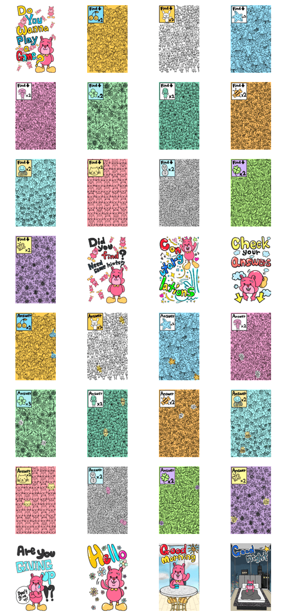 | スタンプ説明 | 隠れている絵を探そう! 友達に送って一緒に遊んで、答えも送れるよ⭐︎ ※このスタンプはトークルームで大きく表示されるBIGスタンプです。 |