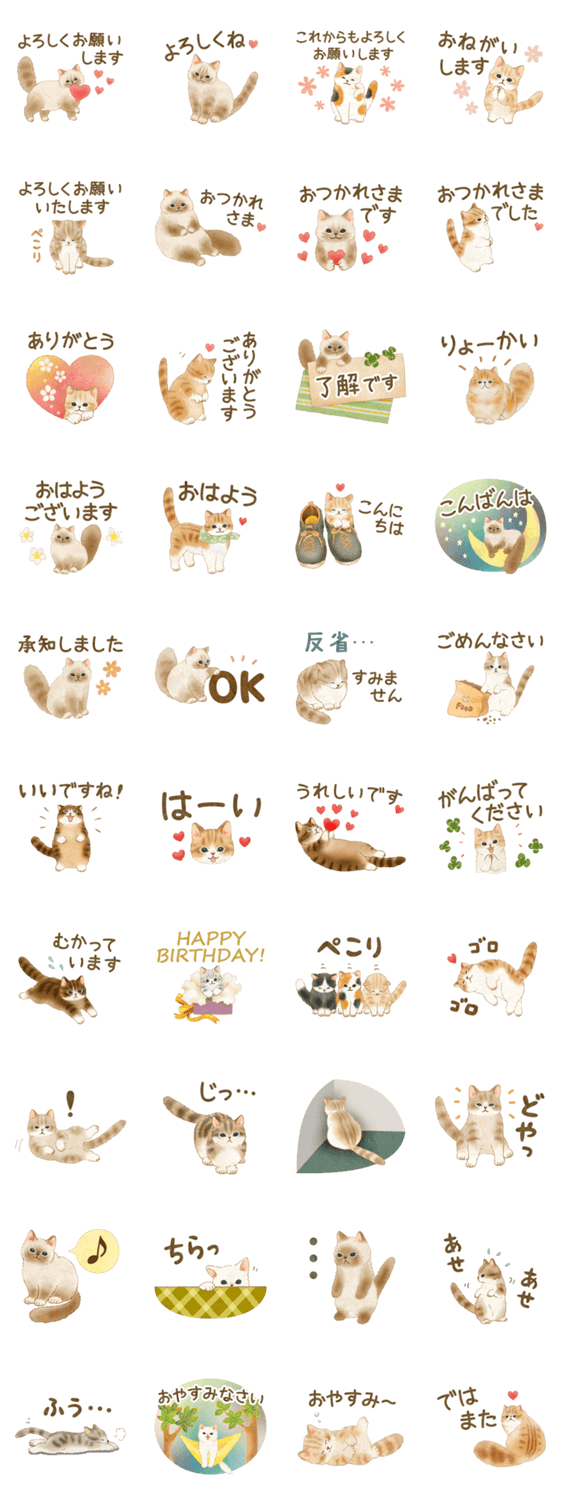 ねこたちのスタンプです。友だち同士で使えるものから敬語まで。色々なシーンで使いやすい、挨拶などの基本のメッセージが中心のセットです。