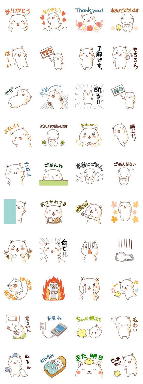 「ありがとう」、「はい」、「おやすみ」など、日常でよく使われる言葉を多く入れました。使いやすいスタンプです。