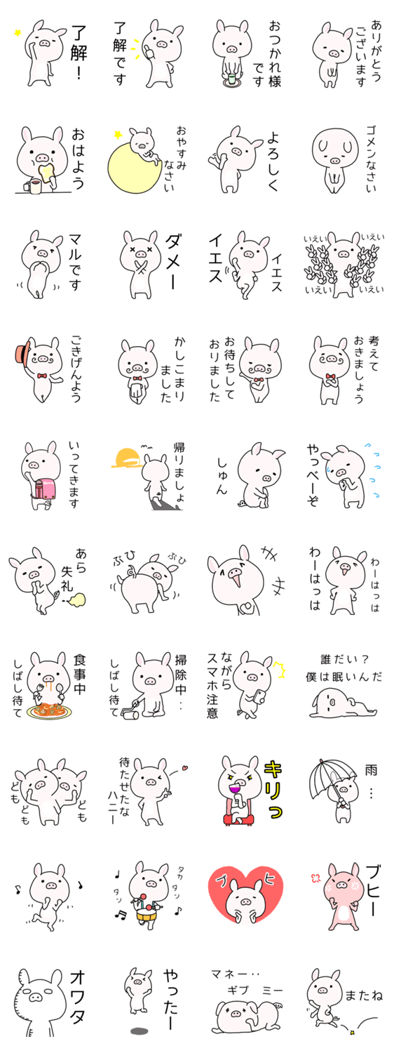 ブタの ぶたぴスタンプです。日常で使える言葉が多目になっています。