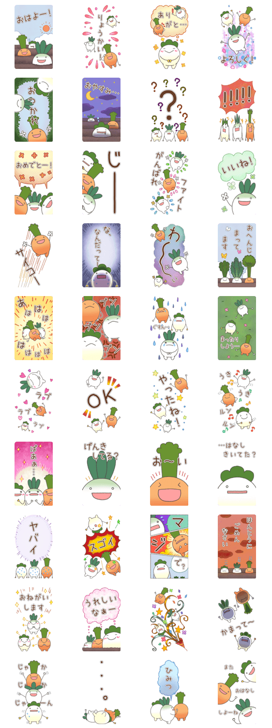 だいこん、にんじん、かぶ…お野菜の小人ねっこちゃんずがでっかいスタンプになりました!毎日使いやすいスタンプで、トークをにぎやかにしよう! ※このスタンプはトークルームで大きく表示されるBIGスタンプです。
