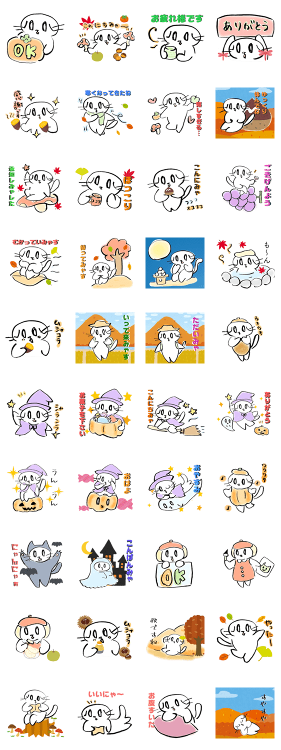秋に使えるスコちゃんスタンプ。ハロウィンや、お月見しているスコちゃんを会話に添えみゃしょう!!