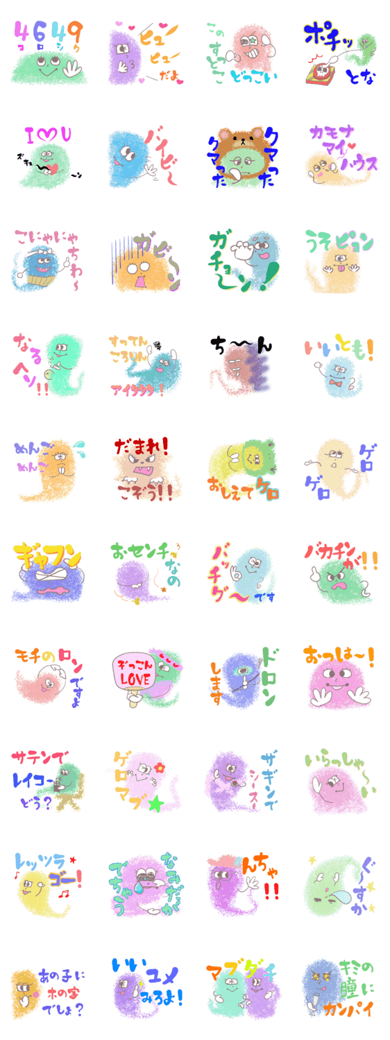 | スタンプ説明 | 煙のようなお化けのようなユラリフワリな不思議な子! 懐かしの死語だらけ!! 青春を思い出す方も 初めて聞く新鮮な方も使ってね |