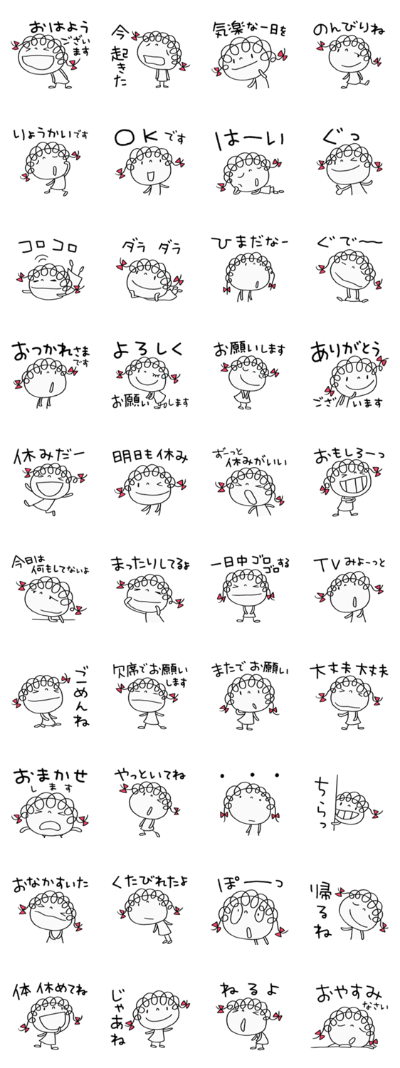 | スタンプ説明 | くるリボン。ダラダラする編。「コロコロ」「ぐで〜」から「ひまだなー」まで。ゆるい感じのくるリボンがいっぱい。くるリボンで、肩の力を抜いて過ごそう♪ |